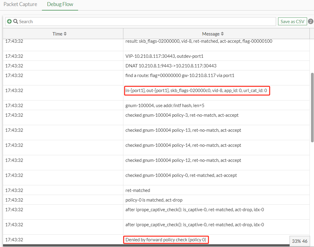 在Forti上 Debug 发现流量从 Port1(WAN口) 进来后,又从 Port1(WAN口) 出去了,没有匹配策略流向 Port2(LAN口) 进入内网,最终的结果就是被默认策略 Policy 0 拒绝, Debug 效果如下图所示: