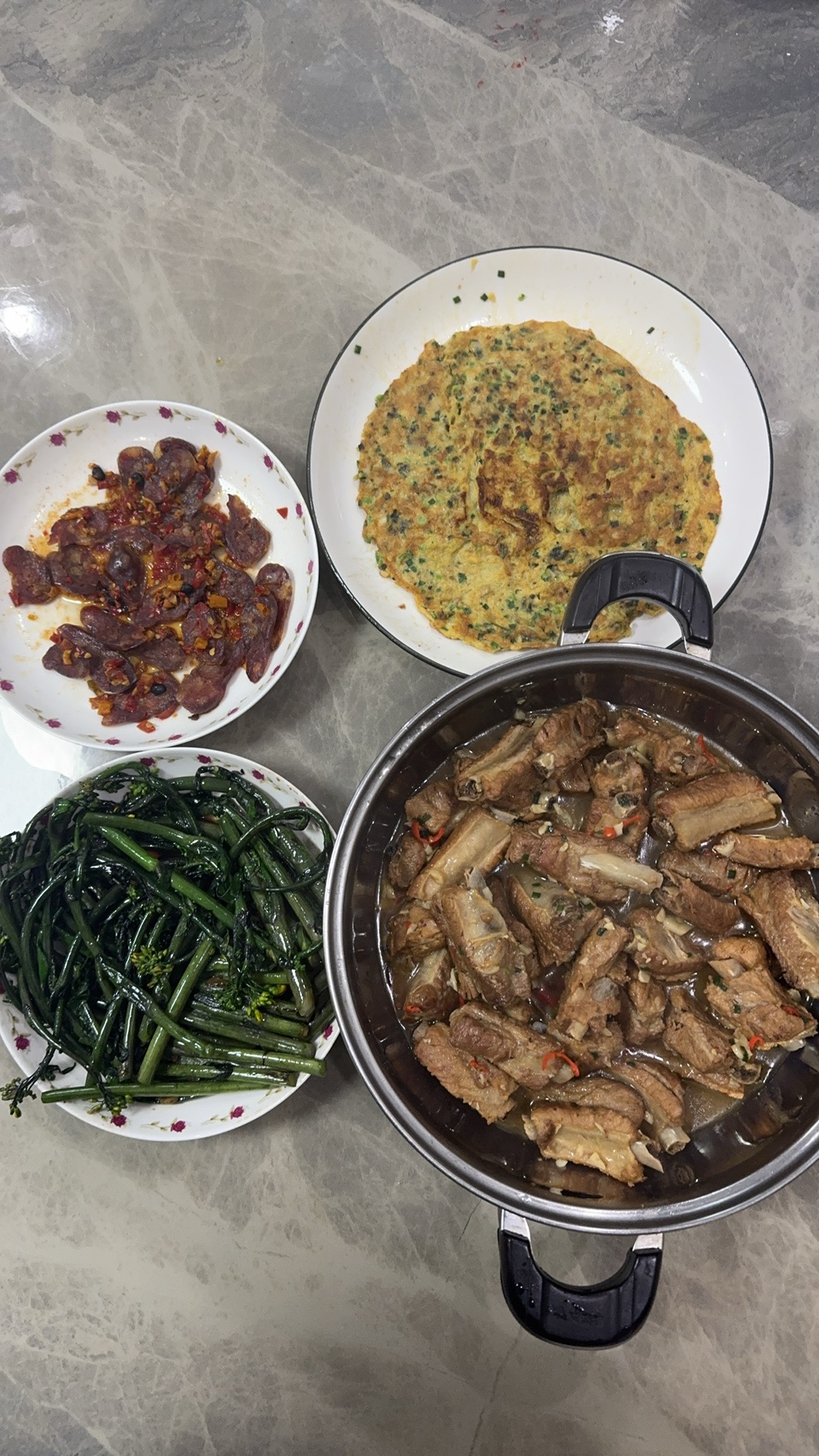 红烧排骨 + 花蛤煎蛋 + 蒸腊肠 + 炒红菜
