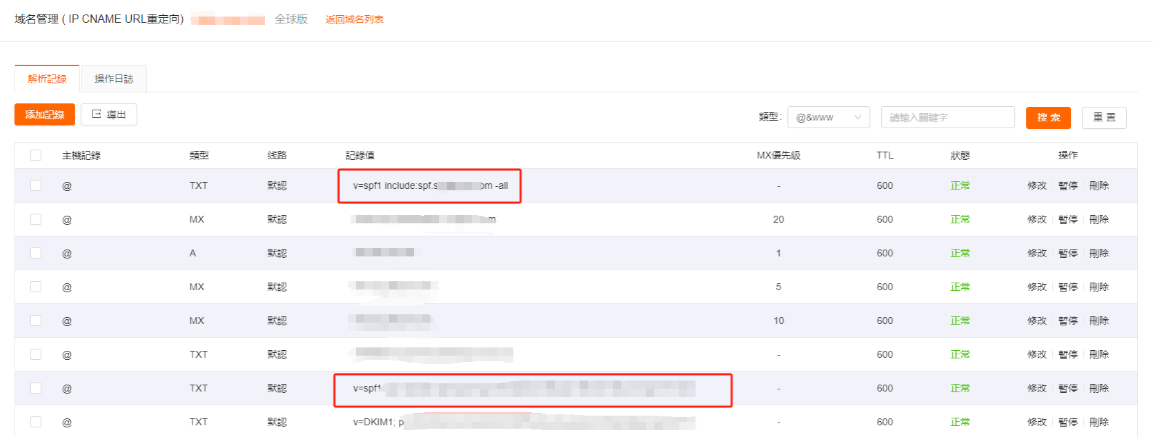 最后我登录到DNS域名控制台才破案,发现这个客户设置了2条独立的 SPF 解析,不同的SPF解析会冲突,导致发信时随机解析一个SPF解析,对的就发信成功,不对的就发信失败,只能删掉1条,或者合并成1条。