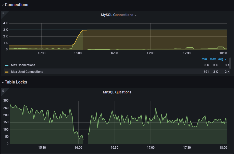 At around 4 pm, we found that the database qps dropped to 0, and we also got a webhook alert from cloud platform about Database connections max limit and ALB HTTP 504 error. DBConnLeak-1 DBConnLeak-2